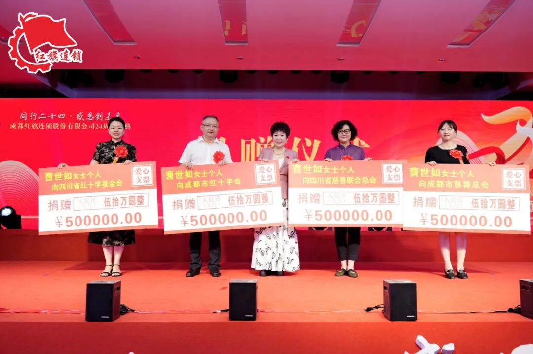 庆典活动上,红旗连锁总经理曹世如以爱心个人名义向四川省慈善联合总会捐赠善款50万元,张山副会长代表总会接受捐赠。
